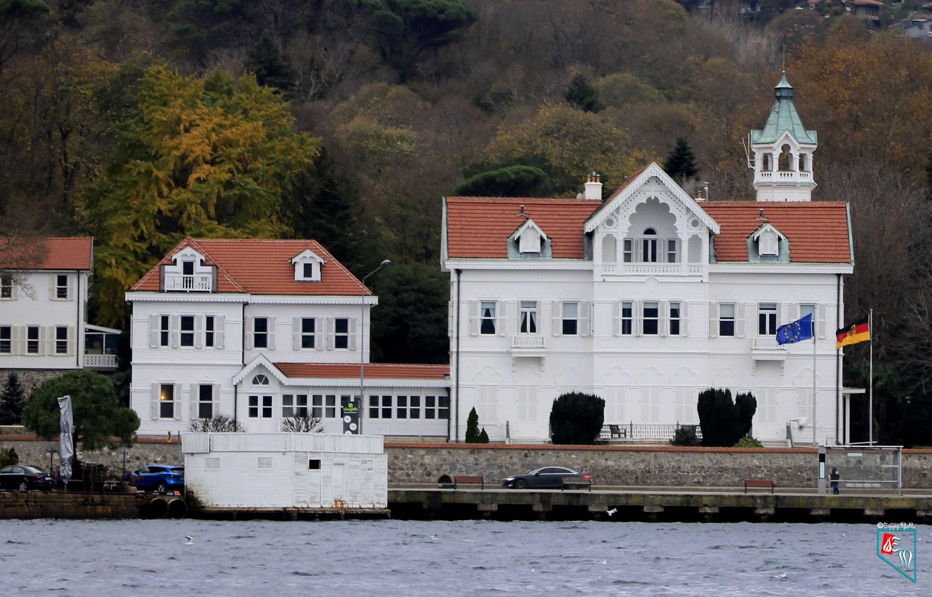 Önde denize bakan elçi evinde eklektisist repertuvara alt kat pencerelerindeki üçlü yonca yaprağı biçimindeki neogotik pencere düzenlemeleri eklenmektedir. Zaman içinde bazı yeni ek binaların da inşa edildiği elçilik arazisi içinde, bahçede eski hamam binasının yerine inşa edilmiş bir de şapel bulunmaktadır. Bahçede, üzerinde kazıma tekniğinde Aziz George’un tasviri bulunan bir çeşme ile mezarlık ve Moltke Anıtı bulunmaktadır.