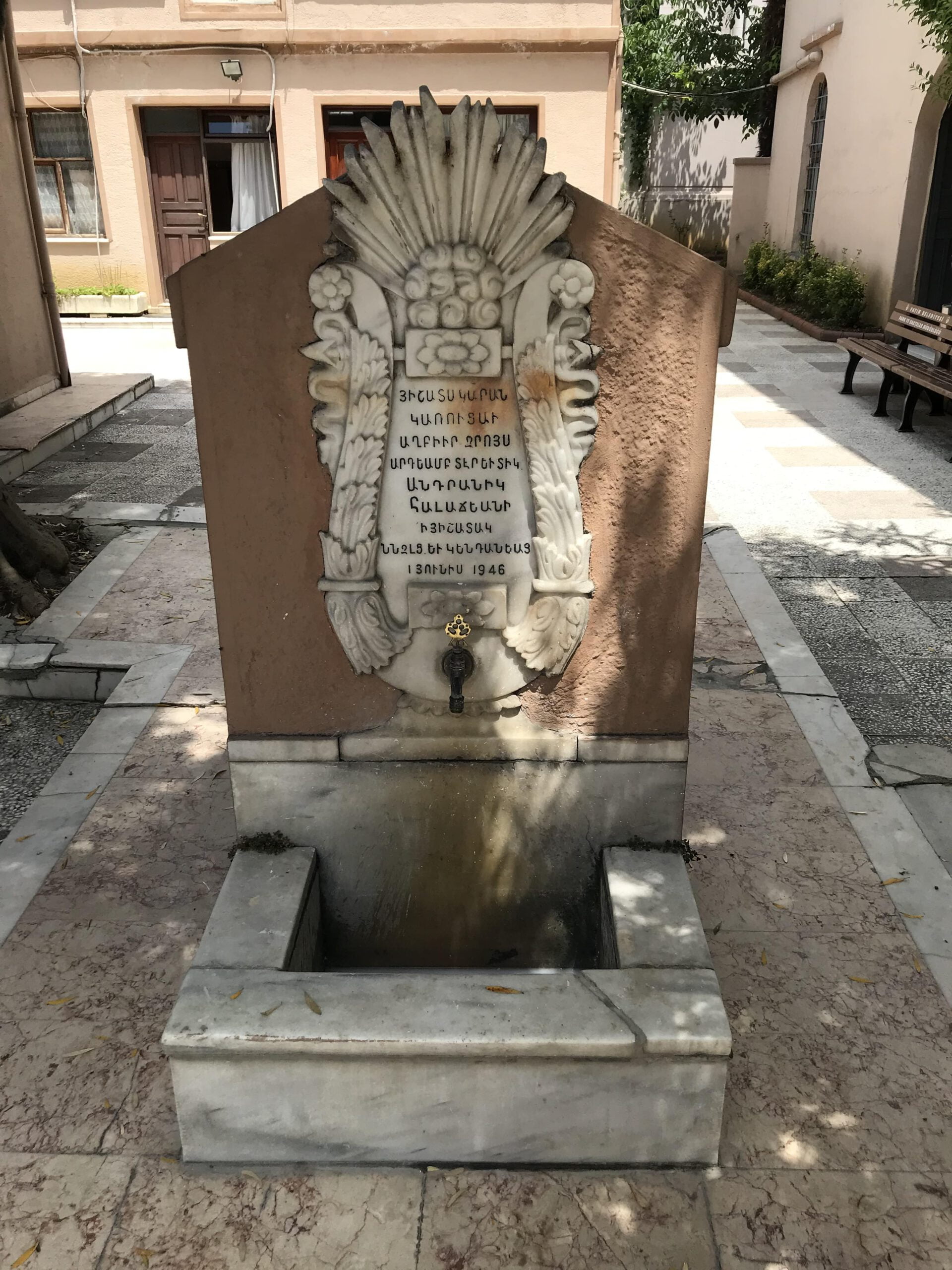 Kitabesinde: Ermenice, “Bu çeşme, Bay ve Bayan Antranik Halacyan tarafından, ölmüş ve hayatta olan yakınları anısına inşa edilmiştir, 1 Haziran 1946.” yazmaktadır.
