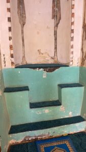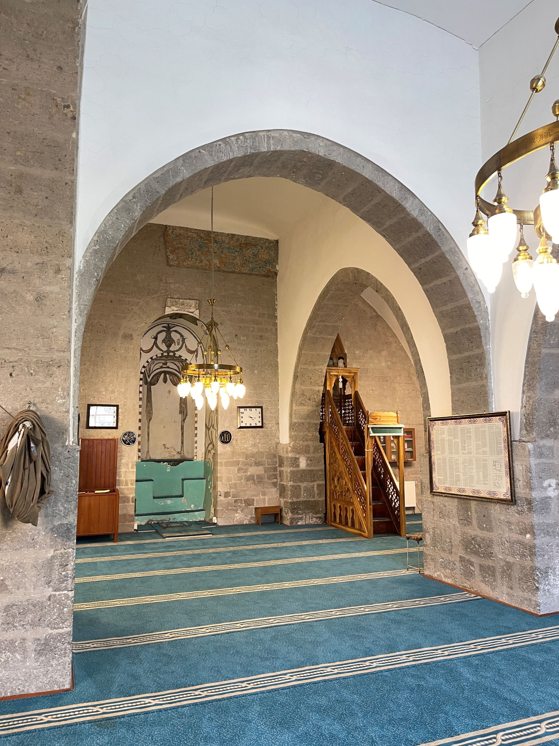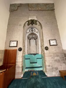 Güney cephedeki mihrab, iki kademeli niş sistemiyle düzenlenmiştir. Alçıyla sıvanmış kesme taş mihrap, oldukça zengin kalemişi süslemelerle bezenmiştir. Birinci kademede Celi-Sülüs hatla yazılmış Âl-i İmrân Suresi’nin 37. ayeti yer alır: “Kullema dehale aleyhâ Zekeriyya’l-mihrâb” (Zekeriyya mihraba her girdiğinde). İkinci kademede barok üslupta yapılmış vazo, perde motifleri ve “S” ile “C” kıvrımları görülmektedir. Üst kısımdaki yarım kubbe içinde de aynı üslupta süslemeler devam eder. Ayrıca mihrabın üst bölümünde, onarımlar sırasında ortaya çıkan ancak büyük kısmı tahrip olmuş firuze renkli çini parçaları, bu bölümün zamanında çini kaplama olabileceğini düşündürmektedir. Ahşap minber ise yakın döneme ait olup sanatsal değer taşımamaktadır.