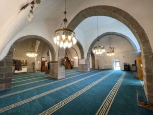Harime giriş kuzey cephedeki hafif sivri kemerli bir eyvan altındaki kapıdan sağlanır. Girişin üzerinde yer alan büyük sivri kemerli pencere, iç mekânı doğal ışıkla aydınlatır. Harim, üç sahınlı bir düzendedir. Üst örtü içte sivri tonoz, dışta düz dam biçimindedir. Tonozlar, ortada yer alan iki bağımsız ayak ve dört cephedeki duvarlara gömülü ayaklarla taşınır. Bu ayakları birbirine bağlayan kemerlerin yan yüzlerinde taşçı işaretleri dikkat çeker. Harim; doğu, batı ve kuzeydeki toplam üç pencereyle aydınlatılır.