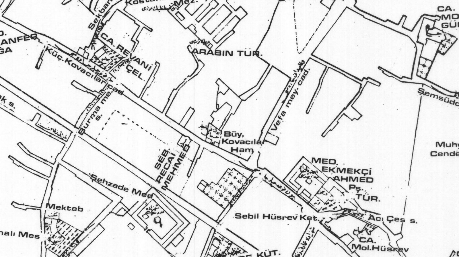 Caddedeki (Eski Kovacılar, yeni Cemal Yener Tosyalı) Büyük Kovacılar Hamamı vaktiyle buradaki konaklardan (Pertev Paşa Sarayı) birinin harem, Küçük Kovacılar Hamamı da selâmlık hamamıymış. Küçük Kovacılar Hamamı, H. 1342 (M.1923) senesi içinde Emin Nureddin Camii (Burmalı Mescit) önünden Unkapanı’na inmek üzere, cadde güzergahında tesadüf ettiğinden hem edilerek (yıkılarak) arsası yola kalbolunmuştur.2