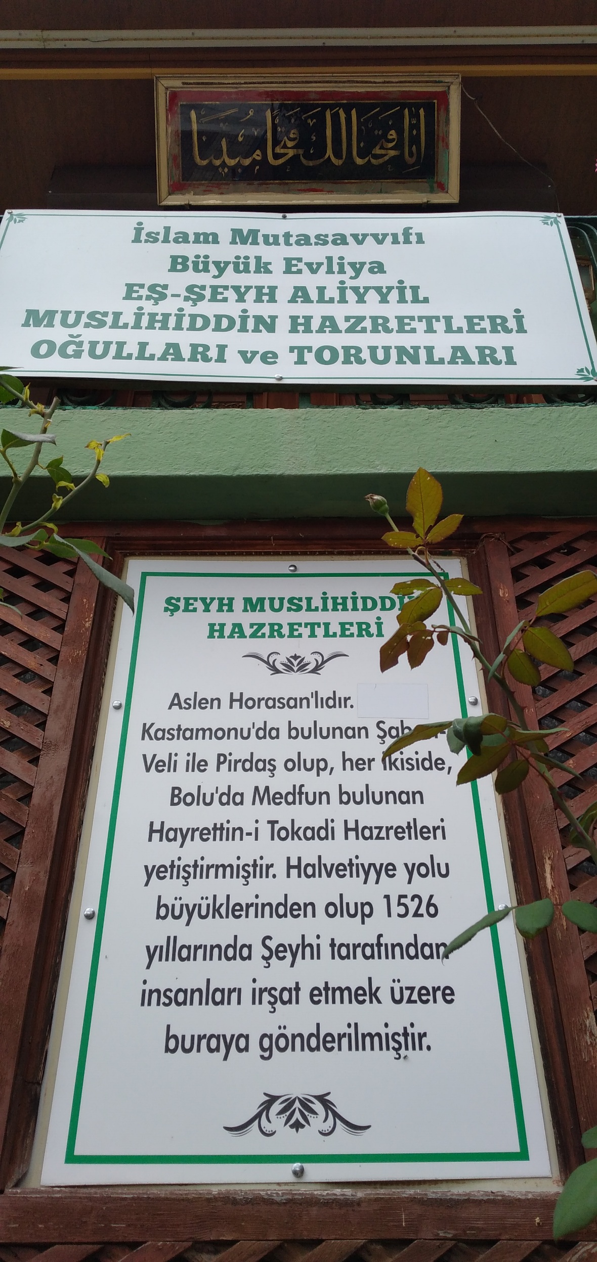 Anadolu’ya gelerek Ankara’da Hacı Bayram Dergah’ında ve İstanbul Fatih Külliyesi’nde ilim tahsilinde bulunan Aliyyü-l Müslahiddin Hazretleri, Kastomonu’da meftun bulunan Şeyh Şaban-ı Veli Hazretleriyle tanışıp arkadaş olmuştur. (H. 904, M. 1526) senesinde İstanbul-Ankara yolculuğunda Bolu’nun Elmalık köyünden geçerken büyük islam mutasavvıfı Halveti Tarikatı pirlerinden Şeyh Tokat-i Hazretlerinin dergahına uğrayarak 12 sene kalıp Tokat-i Hazretlerine hizmette bulundukları rivayetler arasında yer almaktadır.