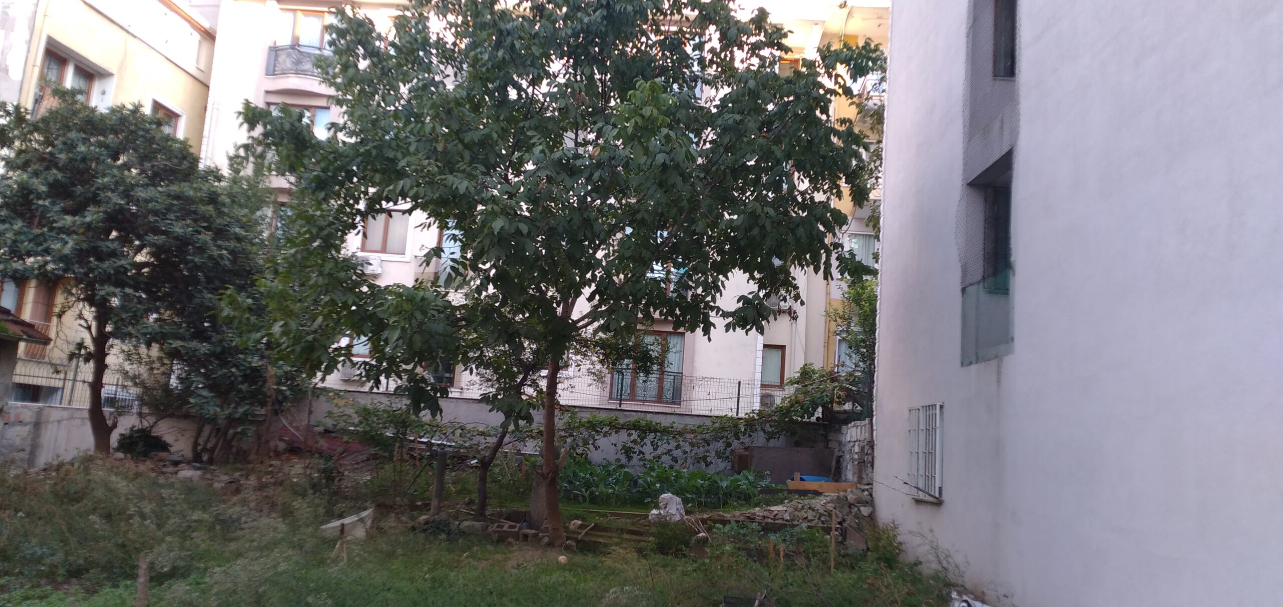 Tekkenin bulunduğu bahçenin demir kapısı aralığından bakıldığında ağacın altında mezar taşı görülebilmektedir.