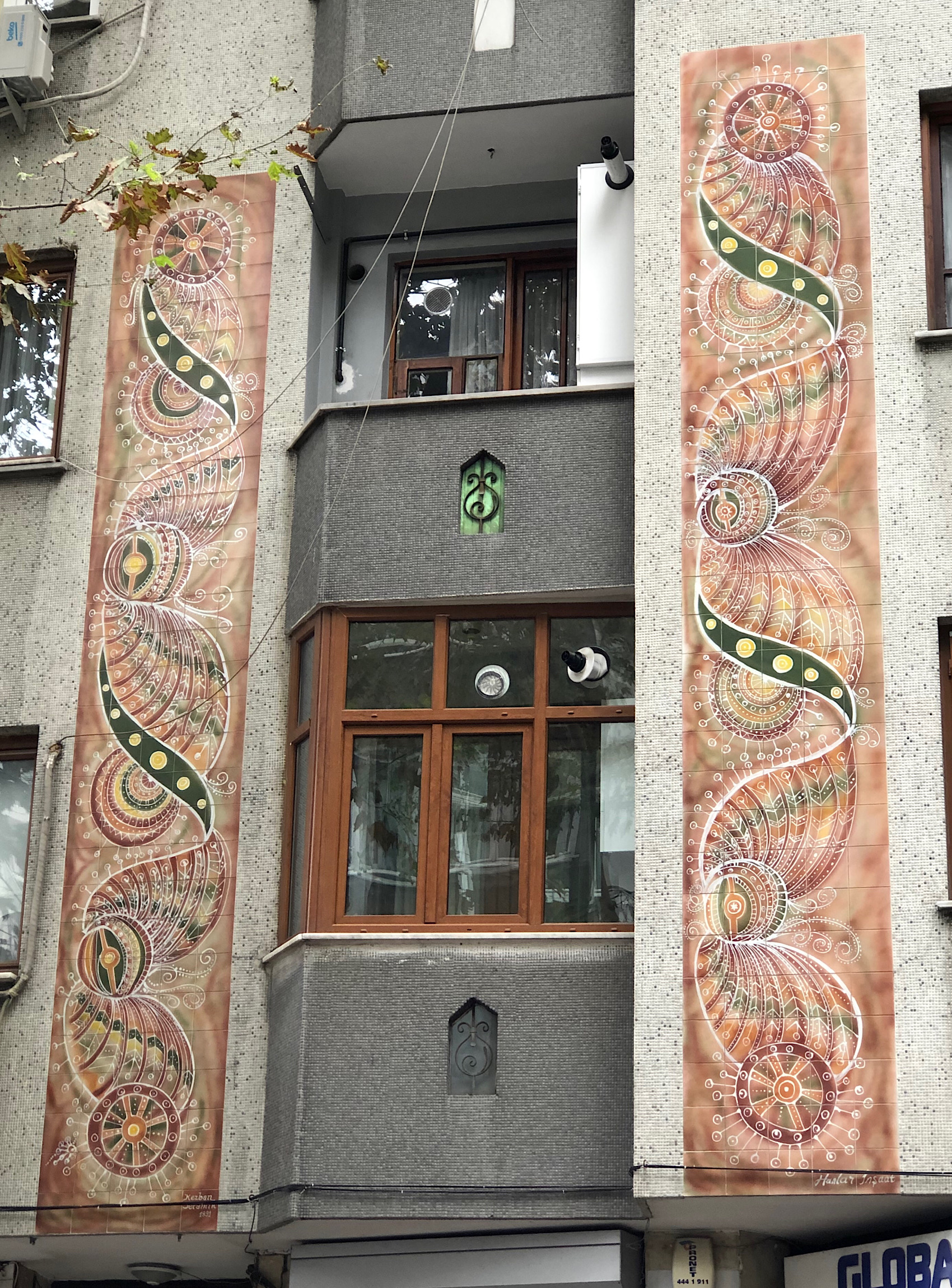 Apartmanın ön cephesine iki parça halinde dikey yerleştirilen, üzerinde Kezban sanatçı imzası bulunan seramik panodur.