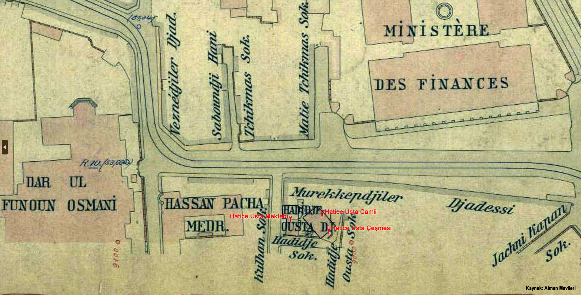 Hatice Usta Camii’nin bir tarafında (1913 Alman Mavileri haritası dikkate alındığında caminin batı istikametinde olduğu anlaşılıyor. E.M.) bir de kârgir mektep mevcut idiyse de mürur-u zamanla yıkılmıştır. 1