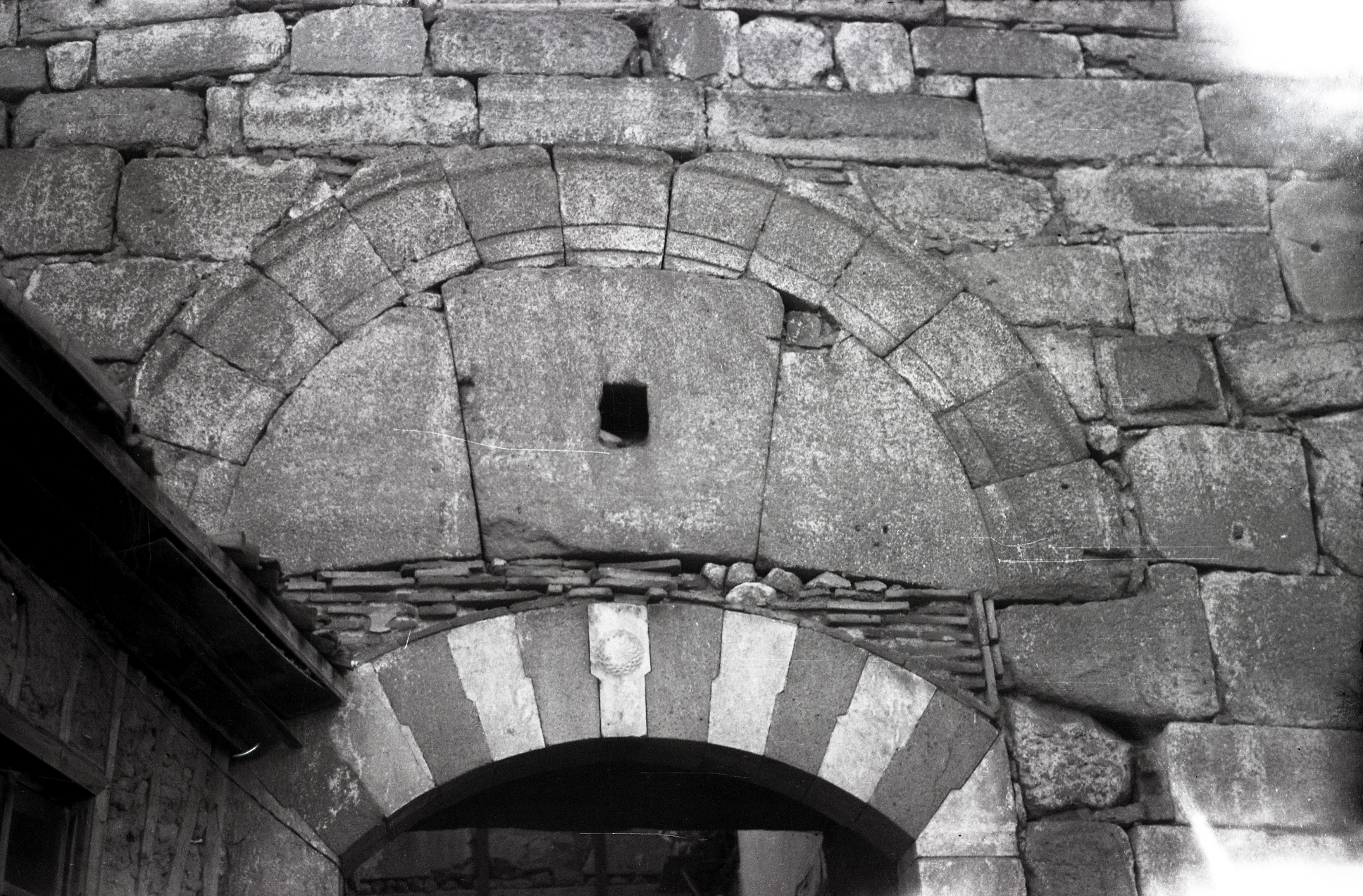 Kapıda yoğun devşirme mermer blok, bulunduğu surda da devşirme mermer bloklar bulunmaktadır.