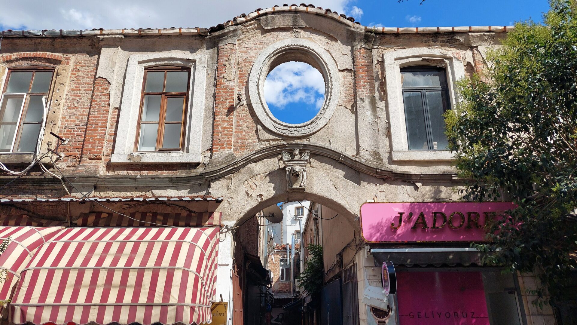 Karakaş Mahallesi, Cumhuriyet Caddesi ile Şükrü Naili Sokağın birleştiği köşede bulunan bina iki katlı ve tuğla yığma olarak inşa edilmiştir. Bina, Cumhuriyet Caddesinden girilip, Şükrü Naili Sokaktan çıkılan üzeri açık L planlı bir pasaj ile ikiye ayrılmıştır. Binanın dikdörtgen planlı bölümü 215 nolu ada, onu saran L planlı bölümü ise 256 nolu ada olarak kayıtlıdır. Zemin kat cephelerinin tamamı üzeri kemerli sıra sıra vitrinlerden oluşmakta, üst kat cepheleri ise sıvalı, kemer akslarında yukarı çıkan sütunçeler ile bölünmüştür. Üst katta pencereler dikdörtgen, üst kısımları basık kemerlidir. Pencere etraflarında çıkıntılı söveler bulunmaktadır. Her iki pasaj girişi, zemin kat seviyesinde kemerler ve onun üzerinde birer oval pencere ile vurgulanmış, binayı çepeçevre dolaşan profilli saçak silmesi, girişlerin üzerinde kavisli bir şekilde yükseltilmiştir. Pasaj giriş kapılarının kemer kilit taşlarını oluşturan aslan figürleri dikkat çekicidir. İki bölümün çatıları birbirinden bağımsız ve üzerileri alaturka kiremit kaplıdır.