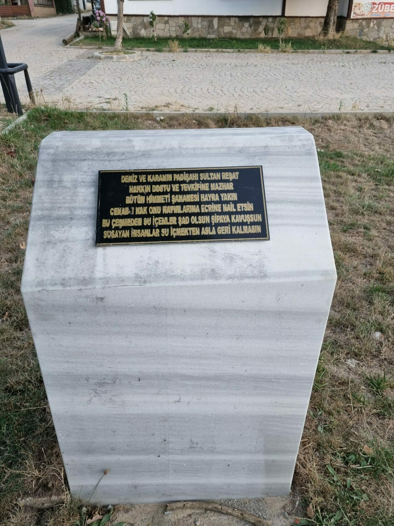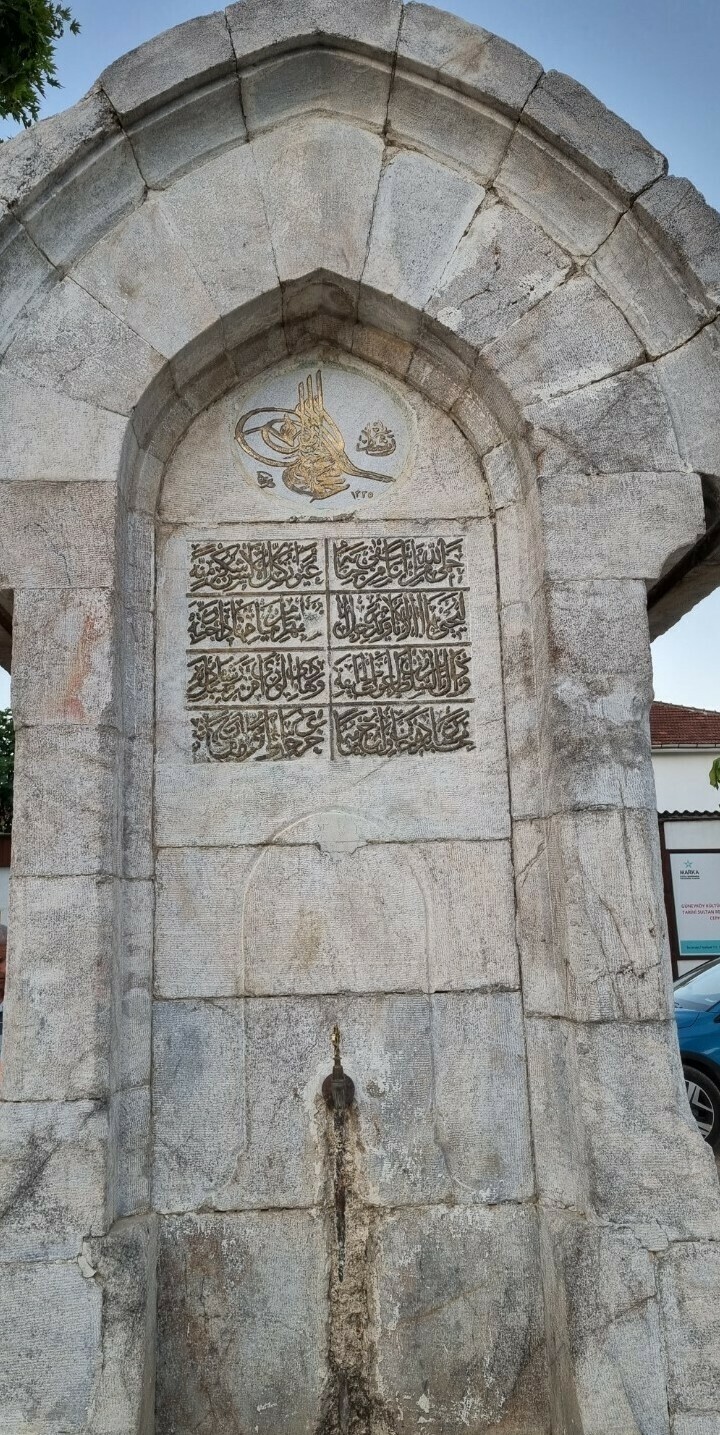 DENİZLERİN VE KARALARIN PADİŞAHI SULTAN REŞAT HAKKIN DOSTU VE TEVKİFİNE MAZHAR BÜTÜN HİMMETİ ŞAHANESİ HAYRA YAKIN CENABI HAK ONU HAYIRLARIN ECRİNE NAİL ETSİN BU ÇEŞMEDEN SU İÇENLER ŞAD OLSUN ŞİFAYA KAVUŞSUN SUSAYANLAR SU İÇMEKTEN ASLA GERİ KALMASIN