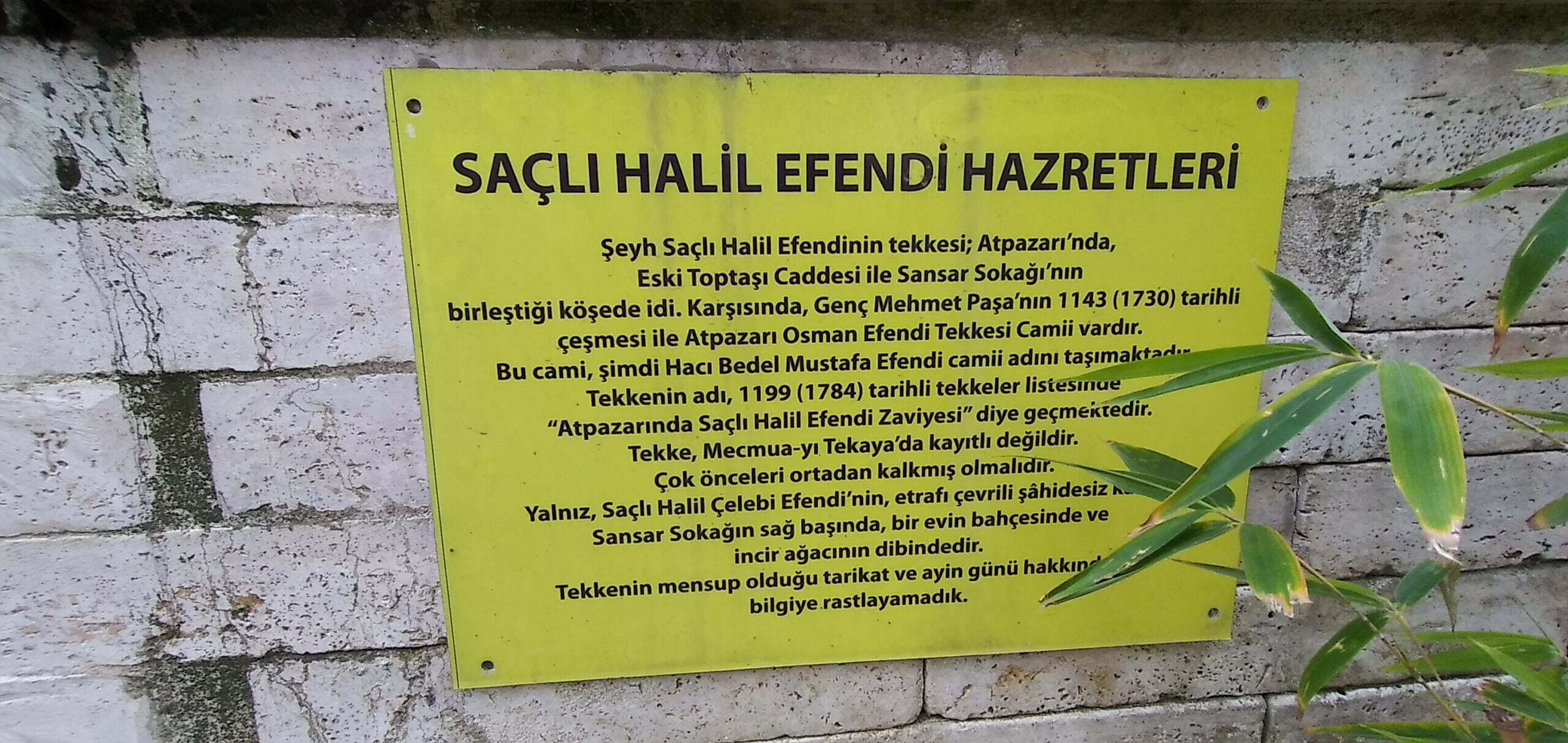 Atpazarı’nda, Eski Toptaşı Caddesi ile Sansar Sokağı’nın birleştiği köşede idi. Karşısında, Genç Mehmet Paşa’nın 1143 (1730) tarihli çeşmesi ile Atpazarı Osman Efendi Tekkesi Camii vardır. Bu cami, şimdi Hacı Bedel Mustafa Efendi Camii adını taşımaktadır. Tekkenin adı, 1199 (1784) tarihli tekkeler listesinde “Atpazarında Saçlı Halil Efendi Zaviyesi” diye geçmektedir. Tekke, Mecmua-yı Tekaya’da kayıtlı değildir. Çok önceleri ortadan kalkmış olmalıdır. Yalnız, Saçlı Halil Efendi’nin, etrafı çevrili şâhidesiz kabri, Sansar Sokağın sağ başında, bir evin bahçesinde ve incir ağacının dibindedir. Tekkenin mensup olduğu tarikat ve ayin günü hakkında bir bilgiye rastlayamadık.