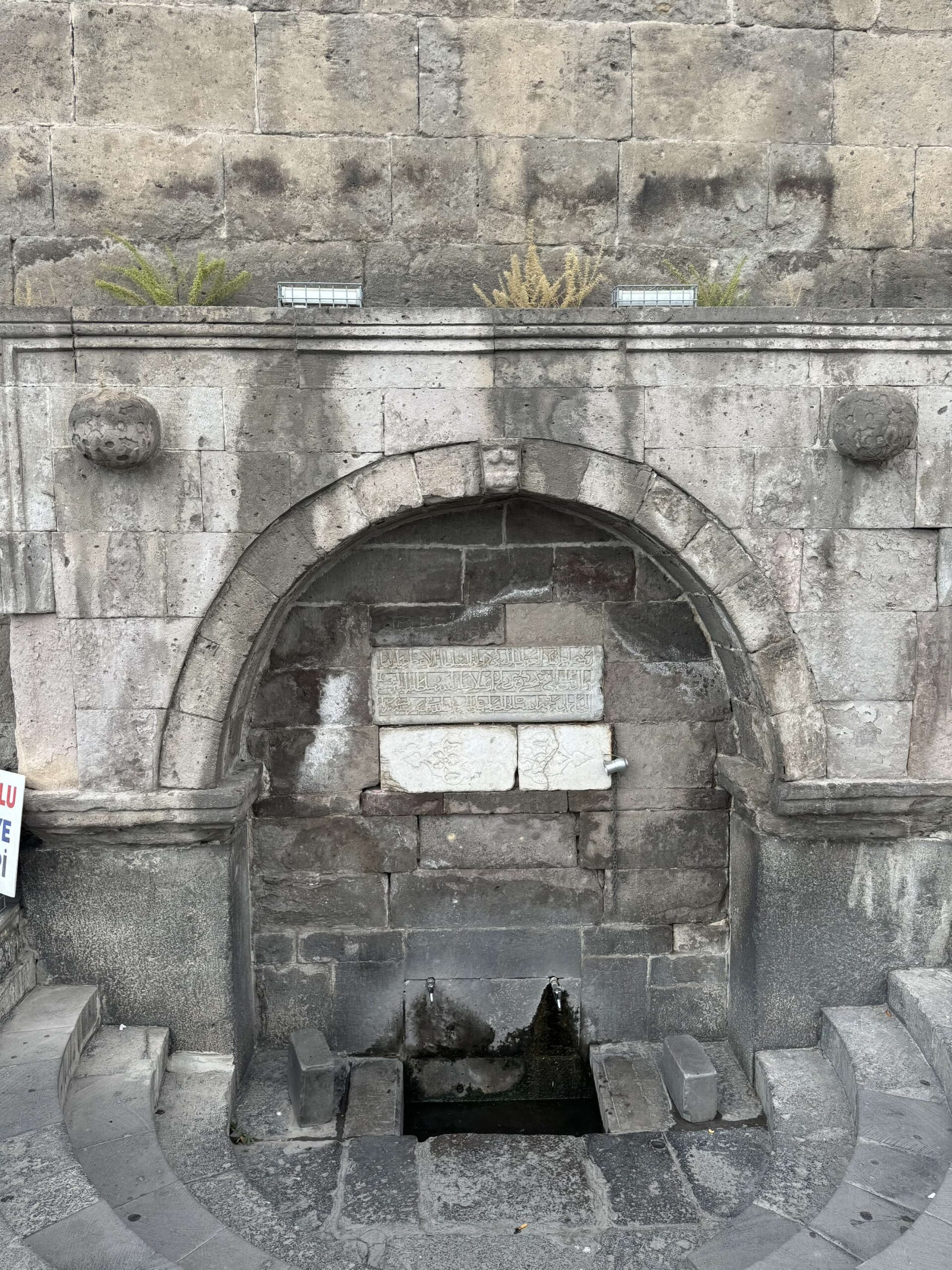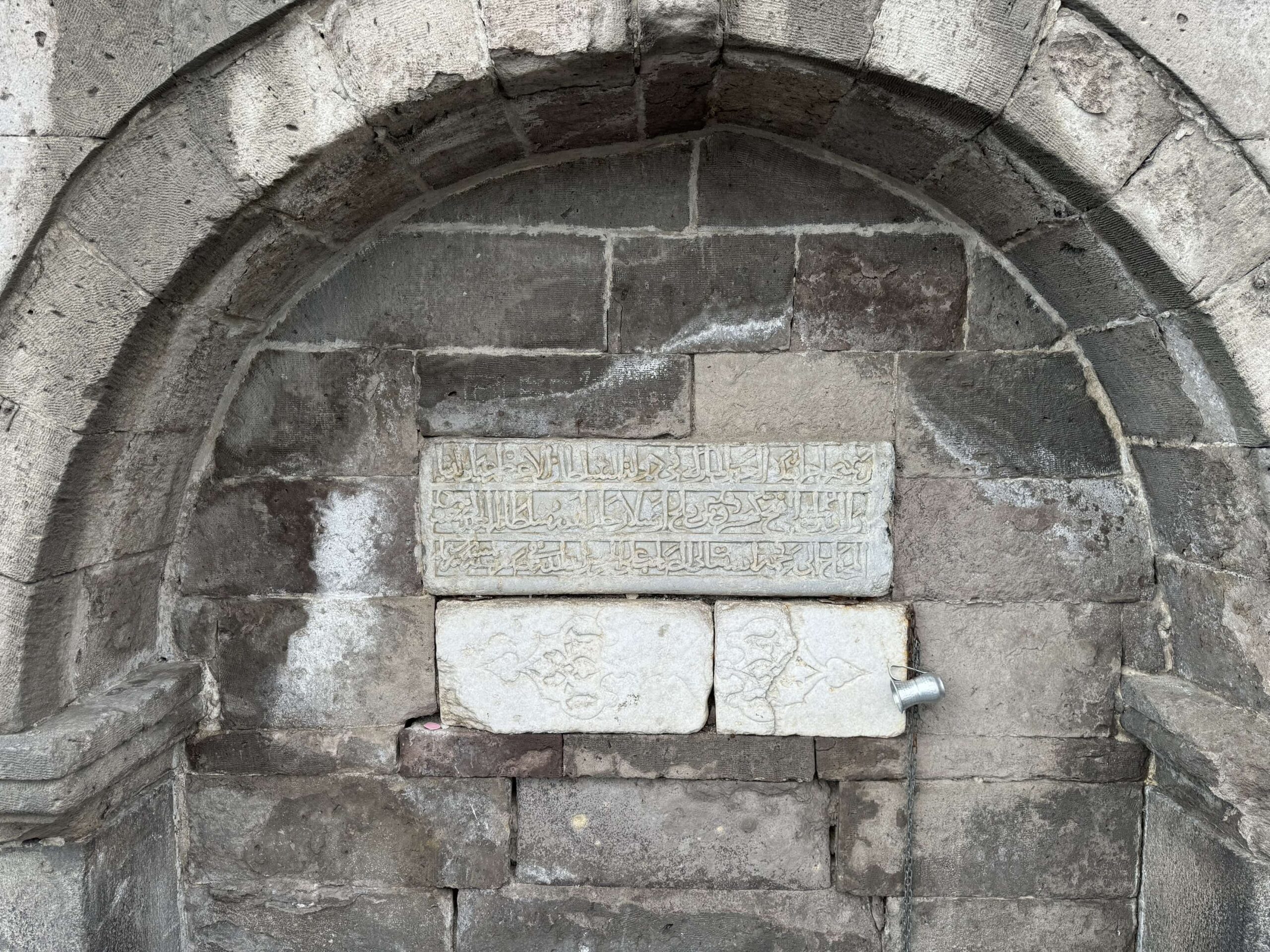 Niş içerisindeki üç satırlık Arapça kitabe Selçuklu sülüsü ile yazılmıştır. Kitabede, “Bu mübarek çeşmenin yaptırılmasını Kılıç Arslan oğlu yüce Sultan, din ve dünyanın koruyucusu fetihler sahibi Gıyaseddin Keyhüsrev Allah’ın saltanatını daim kıla, zamanında, Safer 665 (Kasım 1266) yılında Allah Teâlâ’nın rahmetine muhtaç zayıf kul Hüseyin oğlu Sahip Ata Fahreddin Ali emretti. Allah onu kuvvetlendirsin.” ifadeleri yer almaktadır.