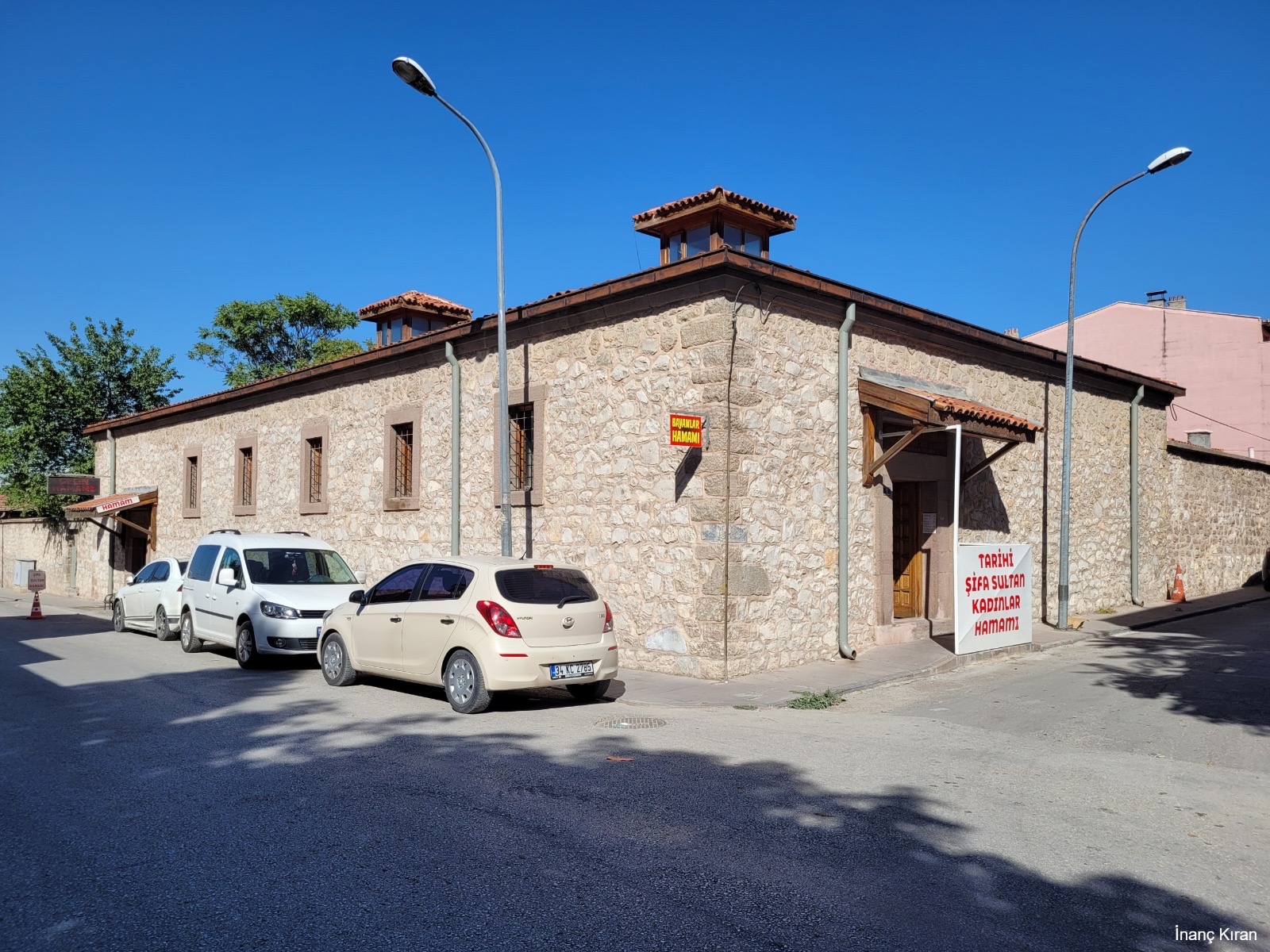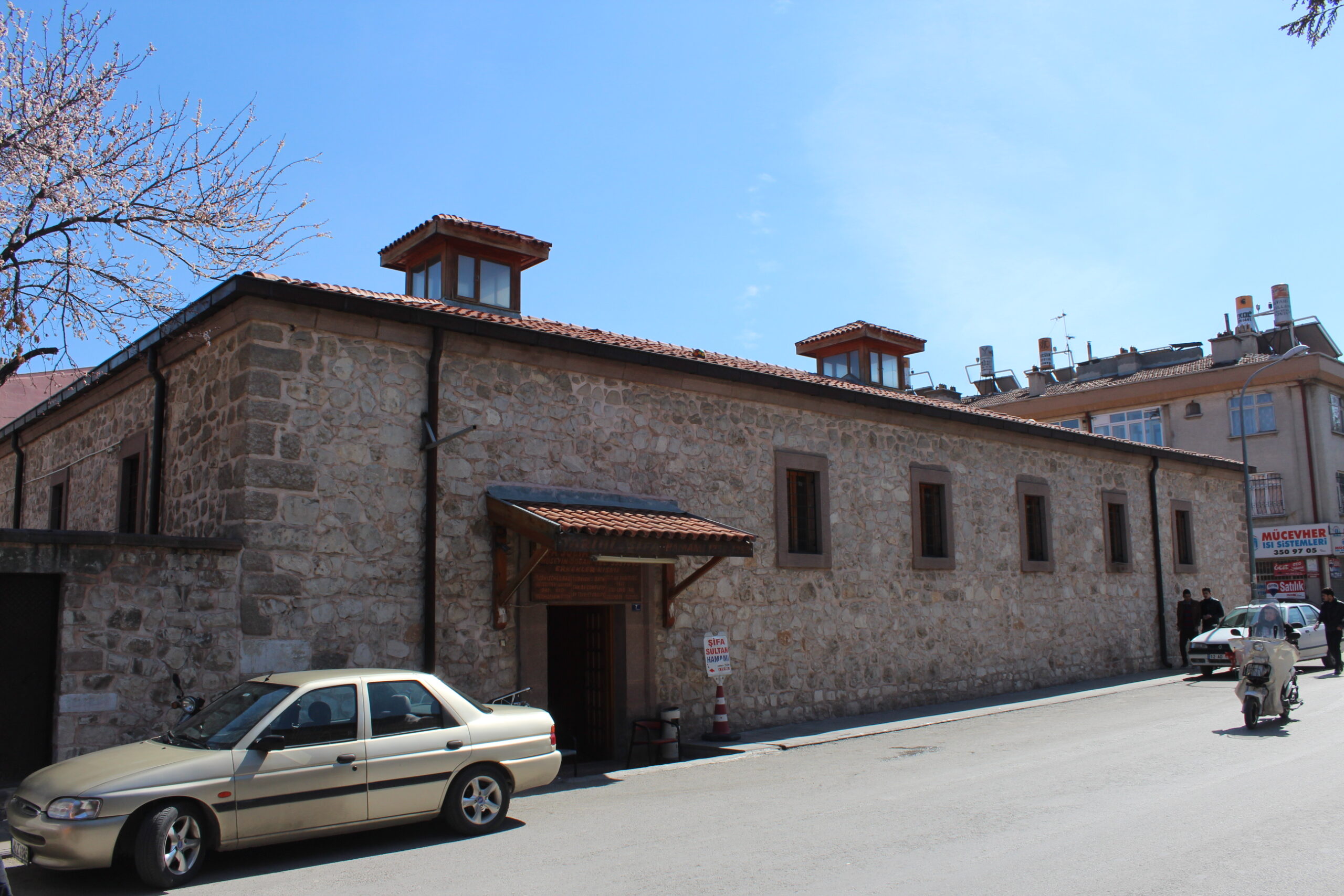 Hankahın karşısında yer alan kitâbesiz çifte hamam 1258-1279 yılları arasında inşa edilmiş olmalıdır. Duvarlarda moloz taş; kemer, tonoz, kubbe ve üst örtüye geçişte tuğla kullanılmıştır. Selçuklu dönemi çifte hamamlarının en büyüğü olan yapı doğu-batı doğrultulu simetrik plana sahip dikdörtgen şeklindedir. Kuzeydeki erkekler kısmı, güneydeki kadınlar kısmıdır. 1934 yılına ait bir tesbite göre hamamın bazı bölümleri değiştirilerek keçe imalâthanesi yapılmıştır. Batı yönünde yer alan soğukluklar kare planlı olup muhtemelen ahşap tavanlı iken bugün betonarme olarak yenilenmiştir. Her iki kısmın üzeri aydınlık fenerlidir. Ilıklıklar bir büyük, iki küçük kubbe ile örtülüdür. Yalnızca erkekler kısmında küçük kubbelerden biri eliptiktir. Sıcaklık bölümleri her iki kısımda dört eyvanlı ve dört köşe halvet hücrelidir. Halvetler kubbe, eyvanlar ise sivri kemerli tonoz örtülüdür. Erkekler kısmının sıcaklığında sekizgen bir göbek taşı mevcuttur. Sıcaklıkların arkasına sivri kemerli tonoz örtülü su deposu ve külhan yerleştirilmiştir.