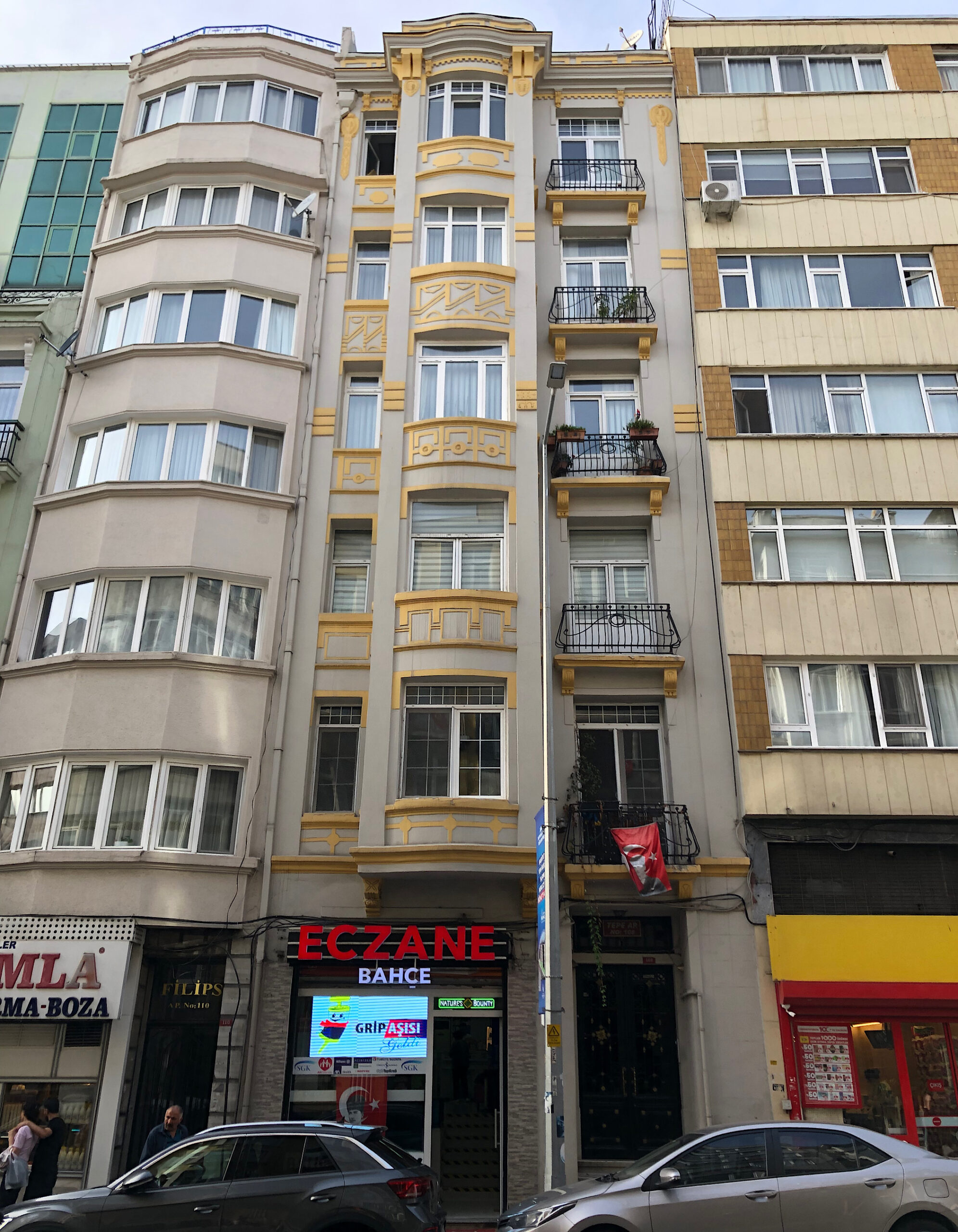 Kurtuluş Caddesi No:108’de yer alan dış cephesi hareketli beş katlı tarihi apartmandır.